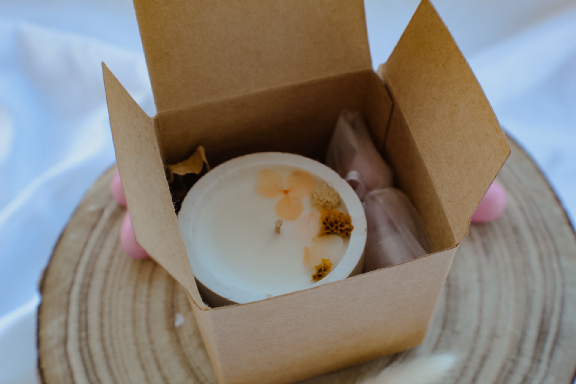 Ogni candela è confezionata con cura in una scatolina kraft marrone, abbellita da un nastro in organza.