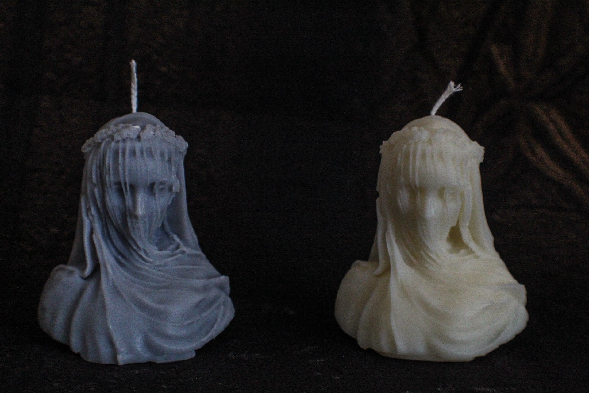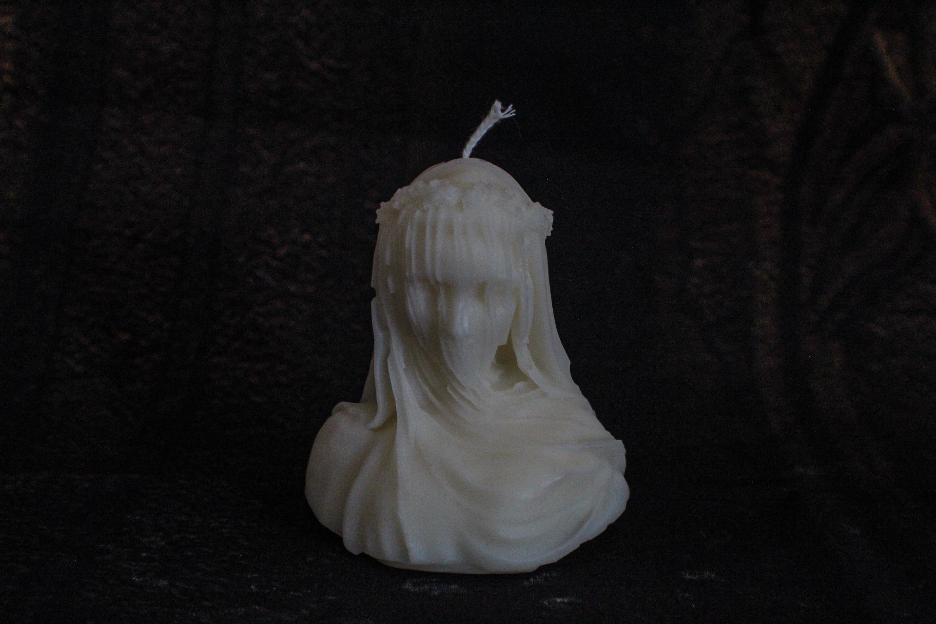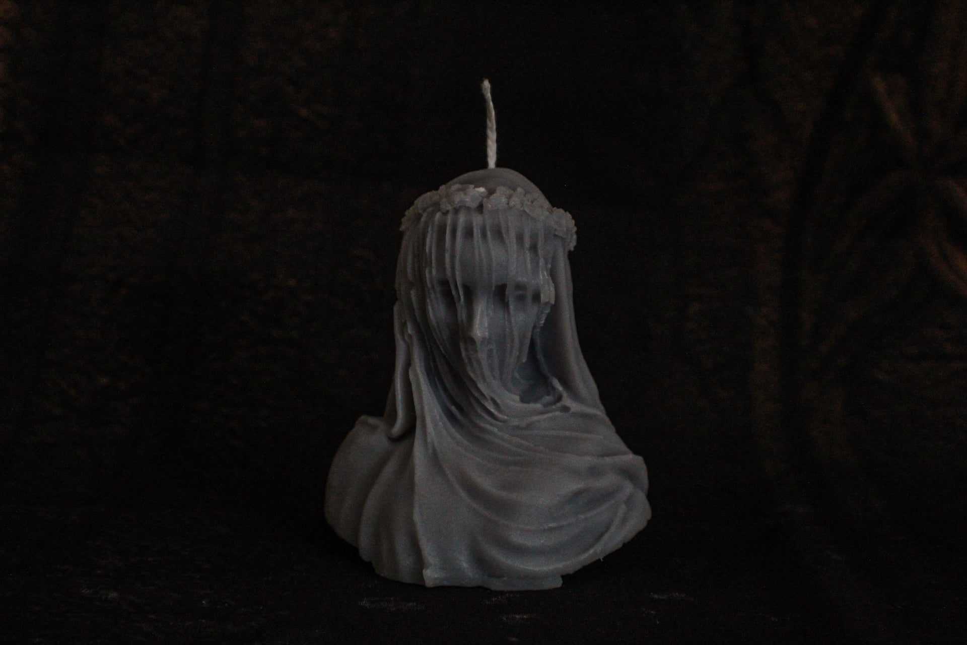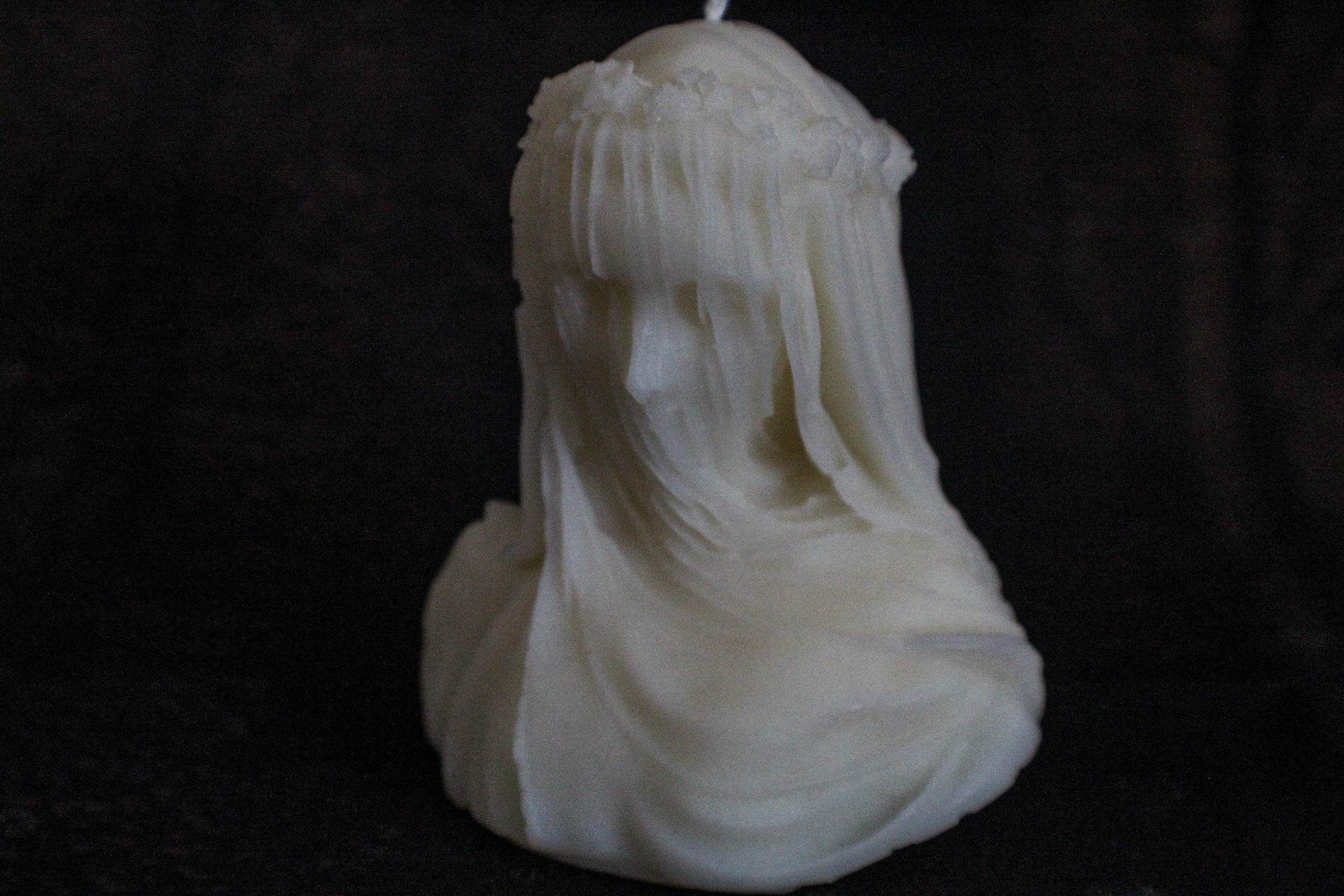 Realizzata a mano in cera di oliva , raffigurante una figura femminile velata, dai lineamenti delicati che emergono attraverso il tessuto scolpito. A completare l'opera, una corona di fiori che ne esalta il carattere gotico e poetico.