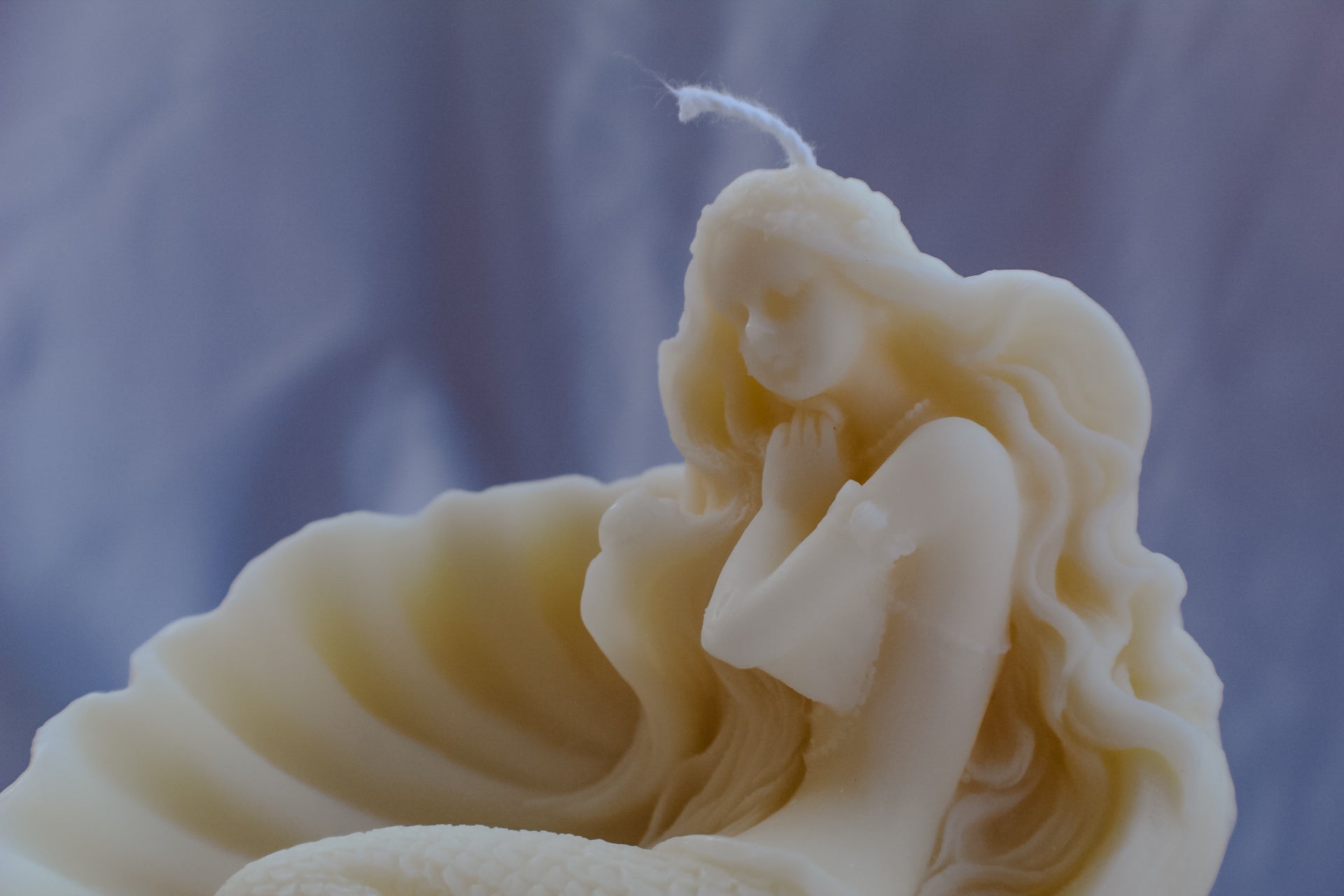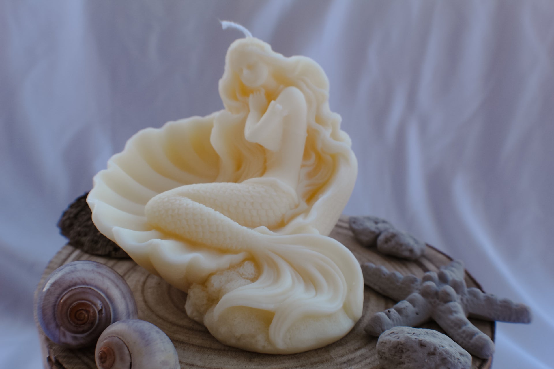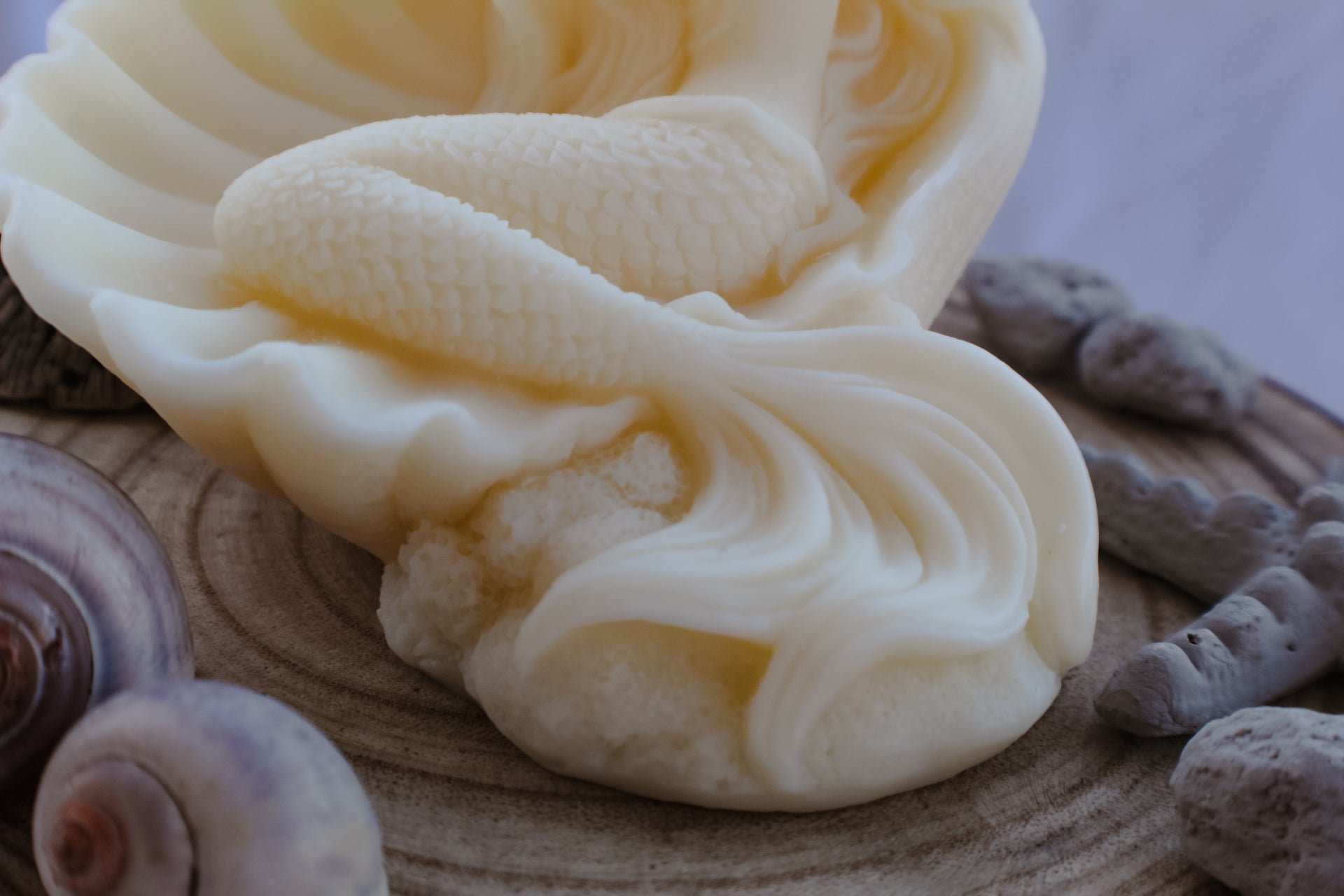 Scilla è scolpita interamente in cera d’oliva, modellata a mano per richiamare la figura affascinante e potente della creatura mitologica che dominava le acque tra Sicilia e Calabria.